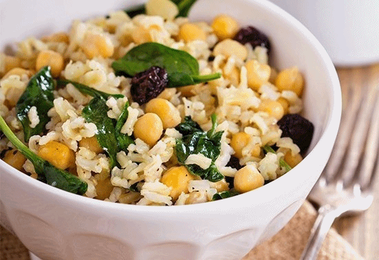 Preparazione: fare rosolare la cipolla, unire i ceci e lasciare insaporire per alcuni minuti. In seguito aggiungere il riso, le spezie, l'acqua di cottura dei ceci e portare a ebollizione, sempre mescolando, facendolo cuocere a fuoco basso fino a quando tutto il liquido verrà assorbito. Unire il prezzemolo, il basilico, la maggiorana e mescolare con cura. Mettere il riso in una ciotola e scaldare per un paio di minuti nel microonde oppure nello scaldavivande elettrico. Completare la pietanza con un goccio di olio.